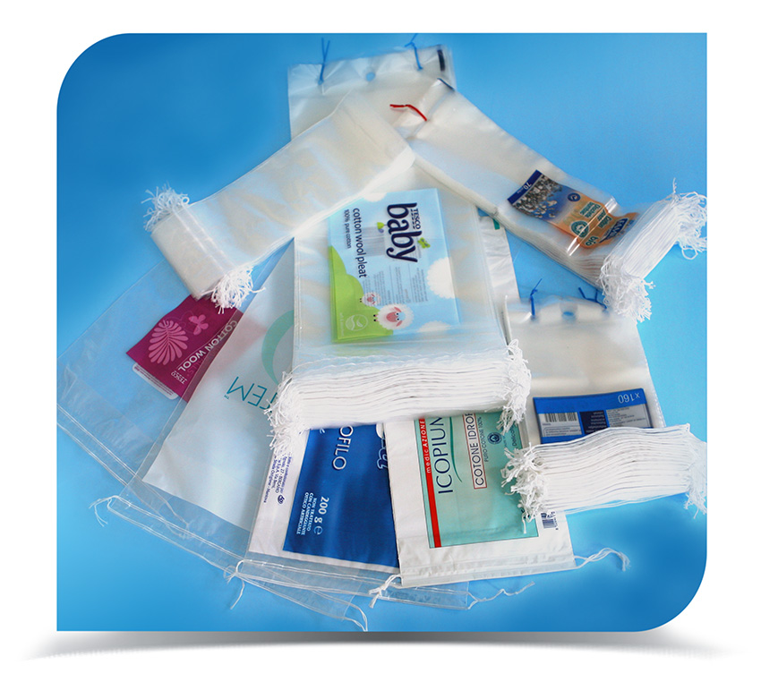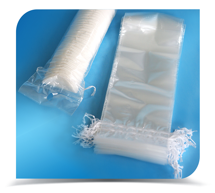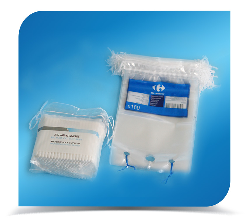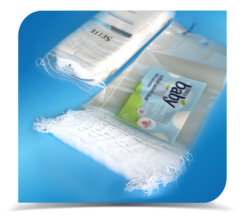 Diese Beutel sind in der Regel für die manuelle Befüllung von Wattepads vorgesehen. Normalerweise befinden sich 2 Paar Schnüre auf der Oberseite des Beutels. Oberhalb der oberen Schnur befindet sich ein Bereich aus Polyethylen, um eine Perforation zu erzeugen und den Beutel nach dem Befüllen mit Wattepads verschließen zu können. Der Endverbraucher reißt das Polyethylen an der Perforationslinie ab, um den Beutel zu öffnen, und verschließt den Beutel wieder mit Schnüren.
